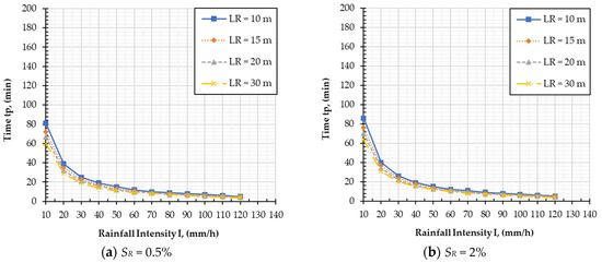 The PFC with a shorter LR provided a wide range of time for surface ponding (tp). The evidence of this can be clearly seen in the case at SR = 4%; with the PFC with LR = 10 m, at I = 10 mm/h, and I = 50 mm/h, tp decreased by 79 min (from 96 to 17 min). Moreover, the values of tp for LR = 15, LR = 20, and LR = 30 m were 69, 63, and 54.5 min, respectively. Thus, the conclusion was that the PFC with a shorter LR seems to be more sensitive to rainfall intensity values than the one with a longer LR. It is of note that the change in LR values did not have a significant effect on the results of tp. This behavior could be seen clearly at high rainfall intensities. In Figure 5, the PFC with different LR values at the high rainfall intensities from 80 to 120 mm/h resulted in close tp values. Thus, it could be concluded that LR had a low impact on the subsurface drainage of the PFC.