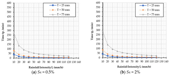 To observe the effect of PFC geometric designs on subsurface drainage, the curves depicted in Figure 5 present the relationship between the length of the equivalent water flow path (LR) and the time for surface ponding (tp) according to the different rainfall intensity values (I). The curves show that there is an inverse relationship between LR and tp; remarkably, the higher value of LR resulted in a lower value of tp. For example, for I = 10 mm/h and SR = 0.5%, as LR increased by 20 m (from 10 m to 30 m), tp dropped by 21 min (from 81 min to 60 min). The behavior indicated that surface ponding could occur faster for the PFC that had a longer LR. This implication is consistent with that found in the studies of Nguyen and Ahn [16] and Liu et al. [30]. According to Luo et al. [31], a possible explanation for this might be that the PFC with a longer LR could accumulate more water from rainfall than the one with a shorter LR. Hence, PFCs with shorter LR performed better than the PFCs with longer LR in subsurface drainage.