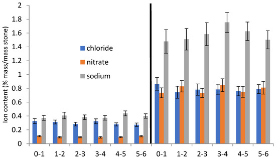 After drying, (at 45% RH), any salts on the surface were removed by brushing, and the percentage of impregnated salt was estimated from the mass increase of the dried stone after impregnation. Each block was drilled in triplicate, using a 4 mm drill bit. The drill was inserted 1 cm at a time and samples collected separately. The stone powders were dried at 110 °C for 48 hours and weighed. The dried powders were extracted with 10 mL of 18.2 MΩ cm−1 water. The water extract was filtered (50 µm polypropylene filter) and analysed with ion chromatography, using a Dionex 600 ion chromatograph (Thermo Fisher Scientific, Waltham, MA, USA), with AS14 columns with 8 mM sodium carbonate, 18 mM sodium bicarbonate eluent for anions, and CS12 column with 1 mM methane sulfonic acid eluent for cations.