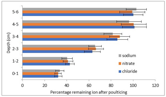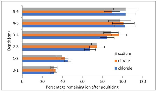 The salt concentrations from the subsequent drillings show reduced levels at 3 cm depth (positive t tests with 96–99% certainty) and likely also at 4 cm (positive t tests with 89–93% certainty). No reductions in salt concentrations at 5 and 6 cm were observed.