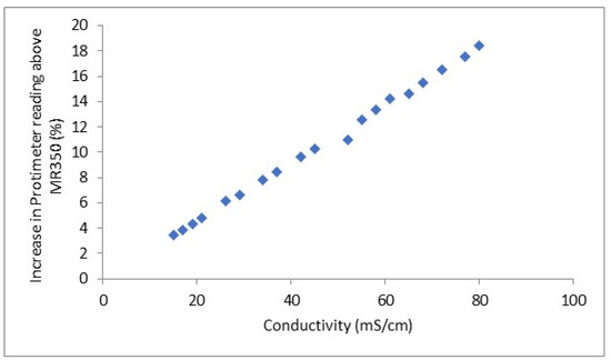 The difference in apparent water content between the microwave and dielectric moisture meter plotted against the measured conductivity of the test solutions is shown in Figure 6.