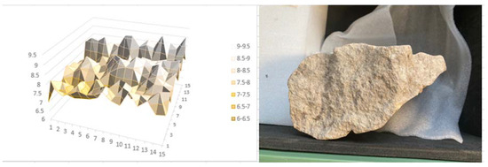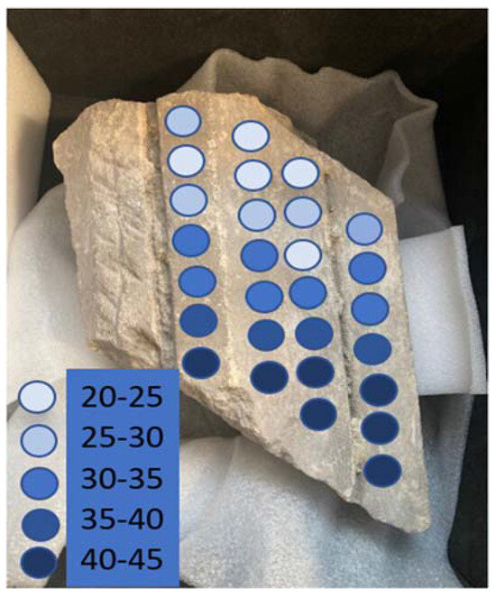 A limestone object, a fragment from the Thetford tombs of the Dukes of Norfolk, was mapped using the Moist 350 microwave moisture meter (hf sensor GmbH, Leipzig, Germany) and Surveymaster (Protimeter, Taunton, UK) in the same points. The salts present had been previously analysed and found to be an approximate mixture of 3:1 nitrate:chloride, with sodium as the major cation. This would indicate a deliquescent RH of 68% RH. The object was humidified to above this value to ensure the salts were in solution for the analysis. Previous storage conditions had exceeded this value at least 20 times per year over the past three decades. The resolution was determined with the 44 mm diameter of the microwave head.