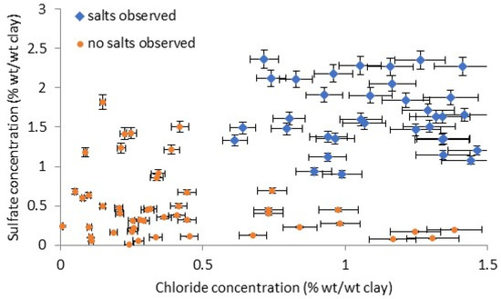 Various combinations of the salt ions present in the tablets were investigated to determine if any gave a good separation between the affected and unaffected tablets. Only chloride and sulphate were observed to achieve this. Nitrate, sodium, calcium, and some potassium were also present, but overlapped. The measured salt concentrations in the analysed cuneiform tablets as chloride versus sulphate are shown in Figure 10. The vast majority of the cations, over 90%, were sodium.