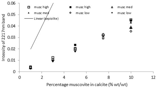The calibration graphs for a representative set of the 12 muscovite clays in calcite are shown in Figure 11 and Figure 12. The data sets for the two regression lines with the highest slope, two with the closest to mean slopes, and two with the lowest slopes are shown. The regression lines themselves are not included to improve clarity of the figures. The pre-viously determined calibration lines for sepiolite [25] are included for comparison.
