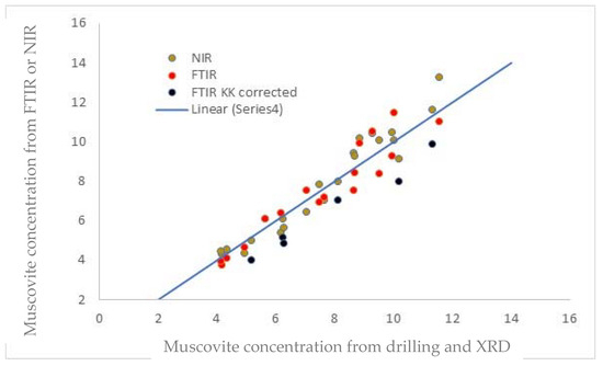 ER-FTIR is prone to generate anomalous spectra due to dispersion effects. If this was strong, the Kramers–Kronig (KK—Nicolet Omnic software) correction produced good peak shapes, but for some mixed examples, it was not successful. Over 60 stone objects were analysed with the muscovite clay present. With multiple attempts, less than 4% of these did not produce identifiable spectra with ER-FTIR, a much lower rate than stones with kaolinite, palygorskite, or sepiolite present. The comparisons with the conventional detection method of digestion followed by XRD are shown in Figure 13. Six of these required KK corrections of the ER-FTIR spectra (marked in black).