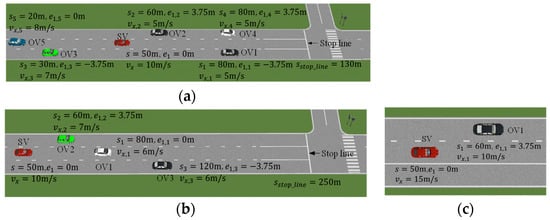 To elucidate and analyze the issue of redundancy and conflict among driving demands, three typical scenarios are established, as illustrated in Figure 2. The initial states are depicted in the figure, with the red light 10 s remaining, and a maximum speed limit of 60 km/h. In the first two scenarios, the obstacle vehicles (OVs) are engaged in lane-keeping maneuvers at a constant speed. In the third scenario, OV1 abruptly changes lanes, decelerating to merge into the middle lane.