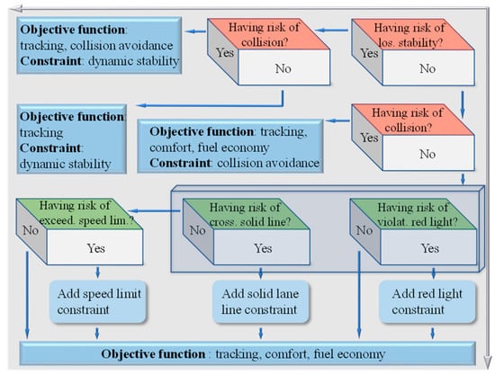 As shown in Figure 4, the HMD strategy evaluates the driving demands according to the priority (See Figure 3). The HMD strategy initiates the evaluation process by first assessing safety-related demands; namely, dynamic stability. If the SV is at risk of losing dynamic stability, the HMD strategy temporarily sets aside considerations such as driving comfort, fuel economy, or adherence to traffic rules. Meanwhile, the collision avoidance demand is formulated as a penalization function instead of constraint, because conflict between two constraints may lead to the infeasibility of optimization. In cases where there is no risk to dynamic un-stability, the dynamic stability constraint is excluded from the NMPC planner so as to improve solution efficiency. When the SV faces a collision risk, the desired states for tracking demands are adjusted to avoid a collision. The specific process is described in Section 3.3. The comfort and fuel efficiency demands are kept in objective function to ensure the smooth changing of state trajectory.