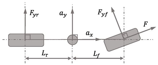 When the SV is accelerating, considering the weight transfer in the longitudinal direction of the vehicle, and the tire lateral–longitudinal force coupling, there are the following relations: