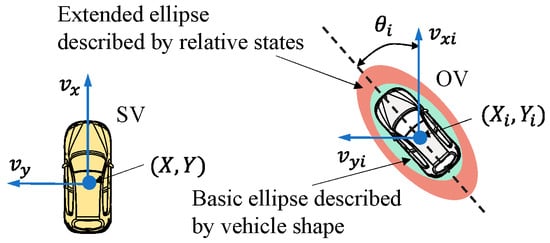 where are the length and width of i-th OV, respectively. are the longitudinal and lateral speed of i-th OV in the vehicle coordinate of SV. The directions are shown in Figure 6. are the longitudinal and lateral acceleration of i-th OV in the vehicle coordinate of SV. is a time constant.