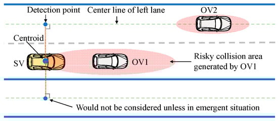 where are weights of different items. The definitions of the items in Equation (13) are consistent with those in Equations (1) and (11). When the SV is at risk of collision, the desired states for the tracking demand undergo modification. Initially, the HMD strategy assesses whether the detection points are situated within areas deemed to be at risk of collision (as illustrated in Figure 7). If all detection points fall within these collision-prone areas, the desired lateral position remains unaltered. However, the desired speed is adjusted to match that of the OV. Conversely, if any detection point is outside the risky area, the desired lateral position is realigned to the centerline of the lane corresponding to the detection point’s location, as depicted in Figure 7.