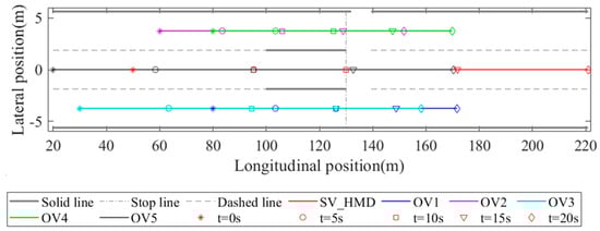 The specific configuration of this scenario is depicted in Figure 2a. Figure 8 illustrates the trajectories of various vehicles. Notably, due to the overlap between the HMD-based and TMO-based trajectories, Figure 8 only presents outcomes of the HMD-based planner.