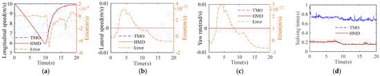 Speed trajectories and solving time of HMD and TMO. (a) Longitudinal speed. (b) Lateral speed. (c) Yaw rate. (d) Solving time.
