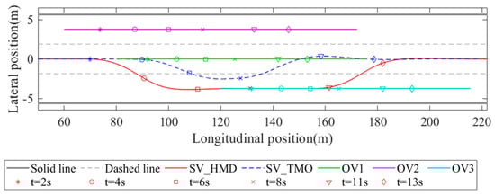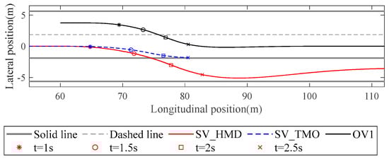 Figure 11 shows that the TMO makes the SV closer to OV1 than the HMD. The reason is that the desired position of the TMO is the centerline of the middle lane all the time, while OV1 forces the SV to leave the middle lane. The compromised result is that the SV avoids OV1 as close as possible. That is bad because the SV would violate the boundary of collision avoidance constraint due to a control error (See Figure 12d, the boundary is defined by in (1f)). Then, the SV needs to change the current control input quickly, which results in a higher vibration amplitude and frequency of acceleration and jerk (See Figure 12a–c). The maximum jerk of the HMD is 58.8% lower than that of the TMO. Through the trajectory in Figure 11 and acceleration in Figure 12a,b, it can be found that the HMD has satisfied other demands, i.e., solid lane line, dynamic stability, etc.