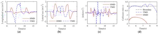 Acceleration, jerk and collision risk of HMD and TMO. (a) Longitudinal acceleration. (b) Lateral acceleration. (c) Jerk. (d) Collision risk.