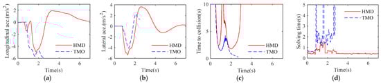 Acceleration, time to collision, and solving time of HMD and TMO. (a) Longitudinal acceleration. (b) Lateral acceleration. (c) Time to collision. (d) Solving time.