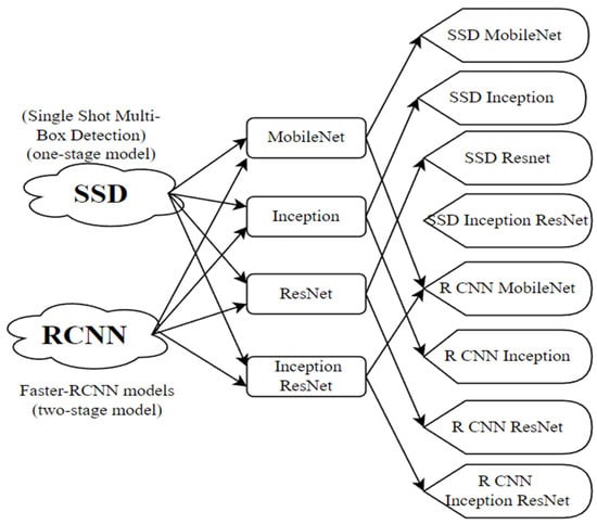 This part of the study will delineate the primary constituents of object detection software: the model for detecting objects and the foundational structures of deep learning employed in extracting features from images. Initially, this research will showcase two models for object detection: the Faster RCNN, a two-stage model, and the SSD model (Single Shot Multi-Box Detection), a one-stage model. Subsequently, it will introduce four crucial deep learning structures used to extract features—MobileNet, Inception, ResNet, and Inception ResNet, Google LLC, Mountain View, CA, USA. Ultimately, the investigation will cover eight detection models formed by amalgamating the object detection model with the feature extraction architectures (Figure 1). The aim is to identify objects in images and subsequently contrast the performance of these models.