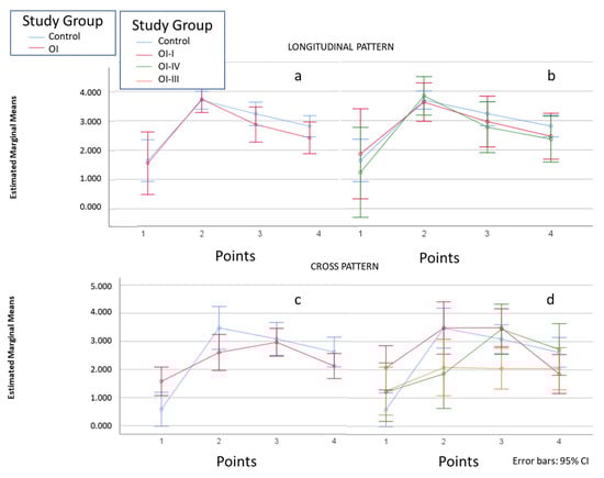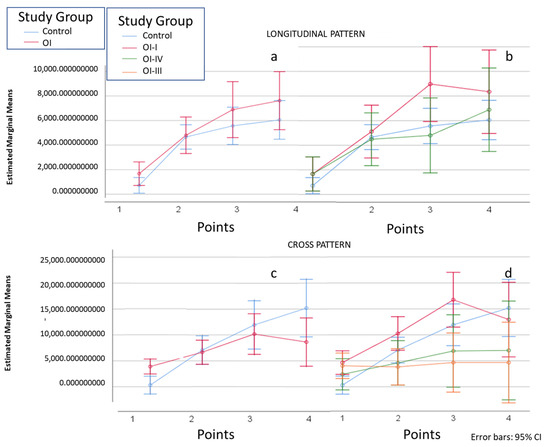 Behavior curve of the tubular diameter in the four points of the dentin studied in the longitudinal (a,b) and cross (c,d) tubular cut pattern with respect to the control group (a,c) and with respect to the types of OI and the control group (b,d).