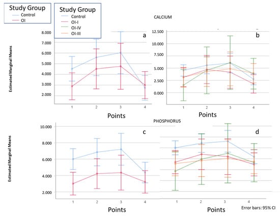Behavior curve of Calcium (a,b) and Phosphorus (c,d) in the four studied dentin points with respect to the control group (a, c) and with respect to the OI types and the control group (b,d).