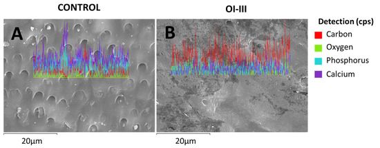 SEM images from the analysis conducted via energy dispersion of X-rays (EDS) of deep dentin at 2000× magnification of a primary second molar from the control sample (A) and from a patient with OI-III (B). The difference in the proportion of mineral components and in tubular characteristics (diameter and density) can be observed.