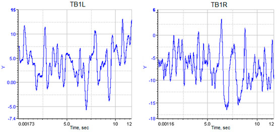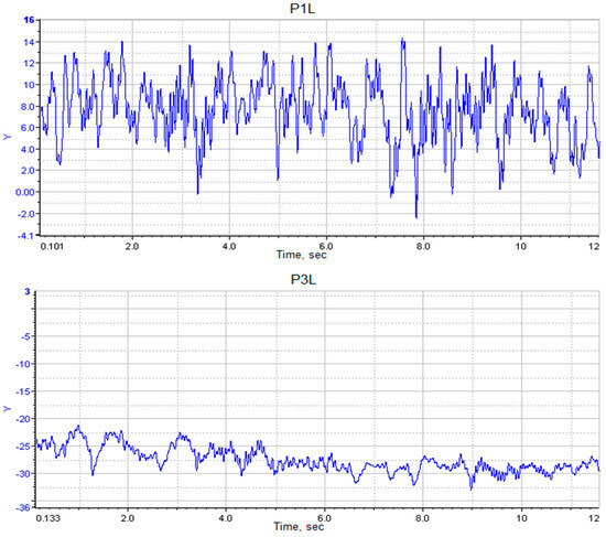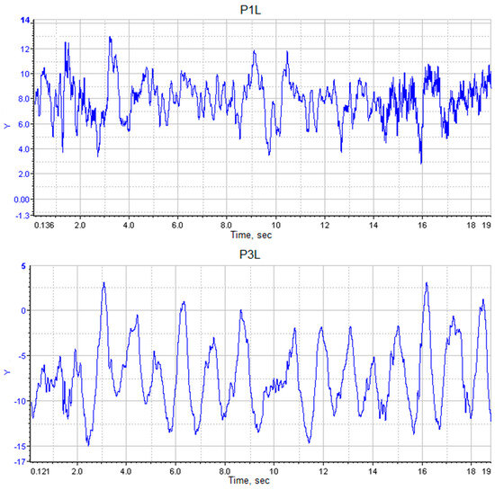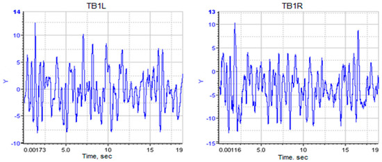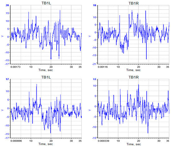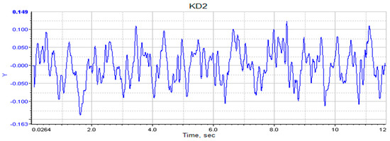 For the data to determine the estimated values of the frame forces, the coefficients of vertical dynamics of the first and second stages of suspension were processed in the same way as in the previous sections [26]. Figure 17, Figure 18 and Figure 19 show oscillograms of primary measurements of dynamic processes recorded while moving in a curve with a radius of 400 m. The processing results are shown in Figure 20, Figure 21 and Figure 22.