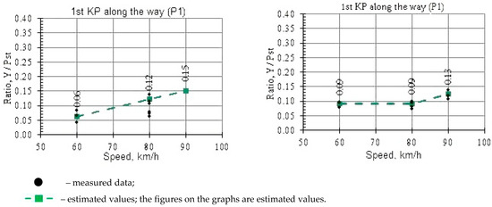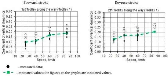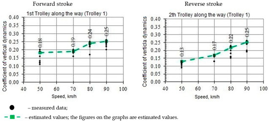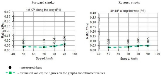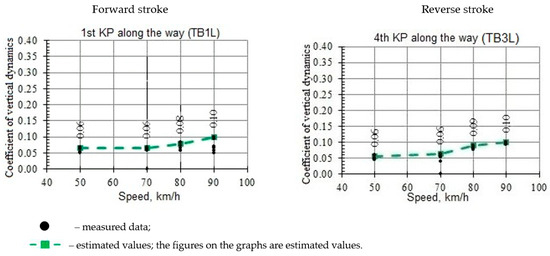 It is worth noting that the limit value of 0.25 for the vertical dynamics coefficient of the second stage was obtained when driving at a speed of 90 km/h, i.e., 12.5% higher than the designated speed [24].