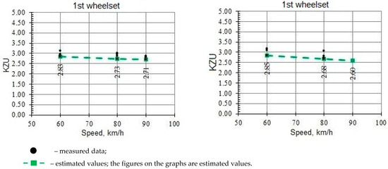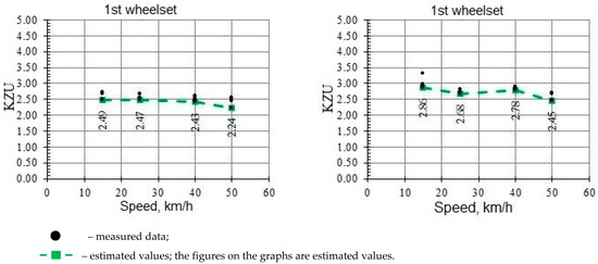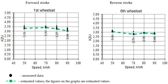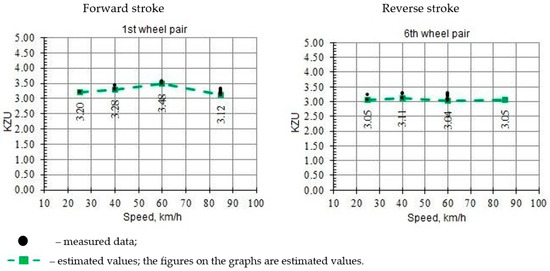 Figure 4 and Figure 5 show that the ratio of frame forces to the static load from the wheelset on the rails is within the allowable range [13]. In the considered range of speeds, when the CKD6e-2108 diesel locomotive passes the turnouts P65 of grade 1/9 and 1/11, this indicator does not exceed 0.31 when moving sideways nor 0.15 when moving in a straight line [16]. Thus, the frame forces of the diesel locomotive during the passage of turnouts P65 grades 1/9 and 1/11 meet the requirements in the entire range of speeds at which the tests were carried out. Based on the instantaneous values of the frame forces and the coefficient of vertical dynamics of the first stage of the spring suspension, the values of the stability factor against wheel derailment were calculated (hereinafter in Figures and Tables—KZU). The minimum value of the stability factor against wheel derailment when passing turnouts is summarized in Table 1 and Table 2.