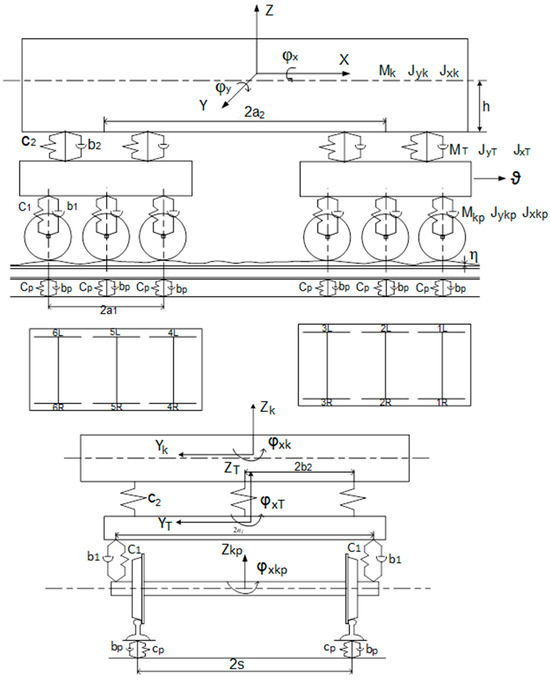 The body and bogie of a diesel locomotive are solid bodies with two degrees of freedom and are connected by elastic and dissipative bonds. Wheel pairs move without separation from the rails. Perturbations from the right and left rails will be taken the same, which allows us to consider plane oscillations [6]. This formulation of the problem is quite sufficient to consider the main dynamic processes in the system [7,8,9].
