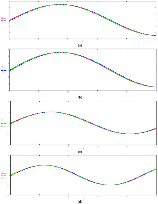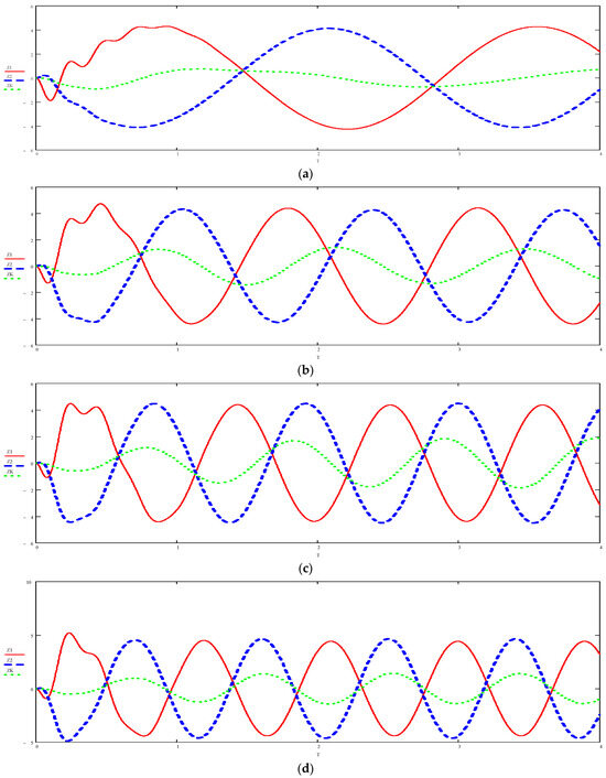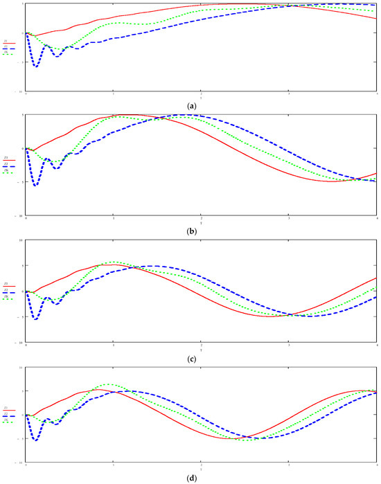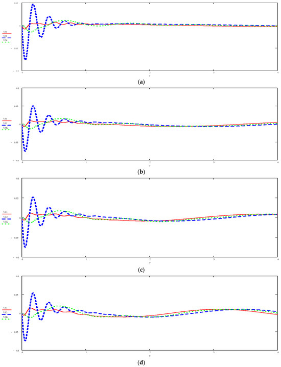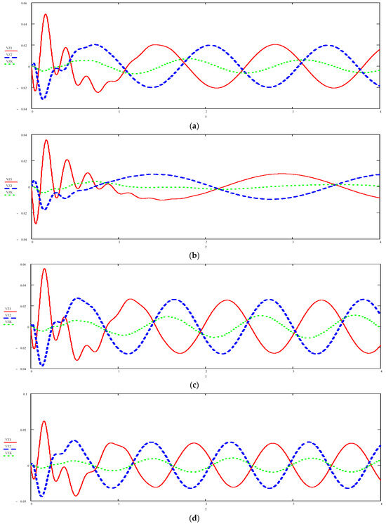 Figure 29. Graph of the movement of the body and bogies when moving along a short unevenness (L = 100 mm) with different speeds. (a) ϑ = 40 km/h; (b) ϑ = 80 km/h; (c) ϑ = 100 km/h; (d) ϑ = 120 km/h.