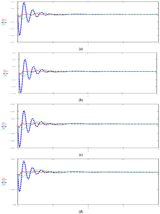 Figure 27. Graph of the speed of movement of the body and bogies when moving along a long unevenness (L = 1500 mm) with different speeds. (a) ϑ = 40 km/h; (b) ϑ = 80 km/h; (c) ϑ = 100 km/h; (d) ϑ = 120 km/h.- -