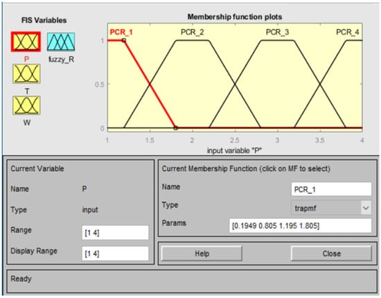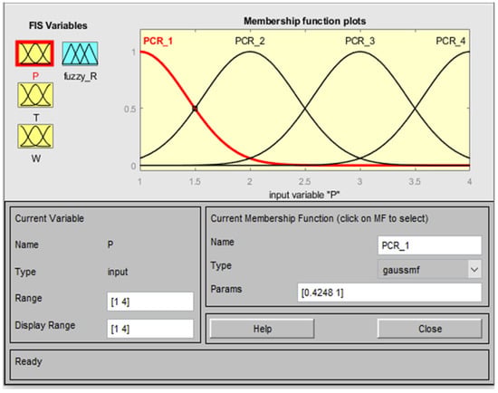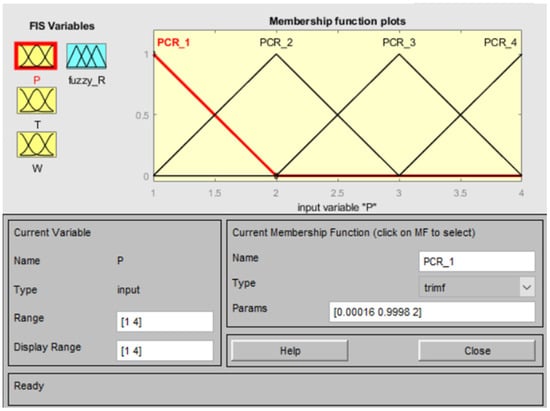Fuzzification, or blurring, is the determination of the degree of belonging of a value to a set. The specificity of the fuzzification process lies in the fact that it allows a measure of imprecision to be added for three factors, represented by the membership function. For each category, each factor can be assigned an inaccuracy defined in words such as “more than,” “between,” or “less than.” This way, inaccuracy is incorporated into the process and allows for a better analysis of possible choices. The scoring and inference phases for a specific investment begin with a subjective assessment of each indicator. Instead of defining the risk categories and calculating the RCR by multiplying the PCR by the TCR and WCR, the proposed method transforms the language terms related to these aspects into fuzzy numbers using previously invoked Gaussian membership functions, trapezoidal membership functions, and triangular membership functions invoked in the MatLab Fuzzy Logic Toolbox, shown in Figure 2, Figure 3 and Figure 4, respectively.