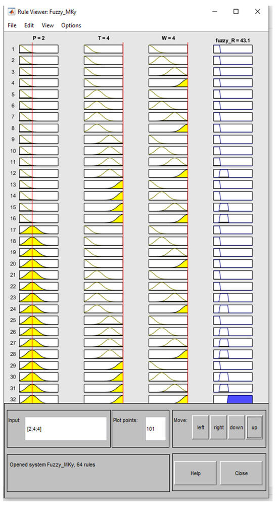 The results obtained with different methods of defuzzification were compared with each other, as shown in Figure 7. As the method chosen for further consideration, the center of gravity—centroid method was adopted due to the fact that those results were the closest to the median of all of the solutions.