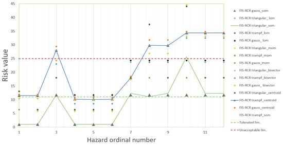 As a rule, the results obtained from the fuzzy logic method are greater than or equal to those obtained from the product method. Therefore, it can be concluded that this approach is harsher. Similar conclusions are presented in Ref. [44], which describes the use of fuzzy logic as an extension of FMEA analysis. The use of fuzzy logic is also supported by adopting a critical level in accordance with Shewart’s cards. The use of fuzzy sets allows for more accurate results to be obtained, which shows that the risks considered acceptable may, after applying fuzzy sets, reach the level of unacceptable or critical risk, as shown in Table 6. This is the main advantage of using fuzzy sets compared to other methods.