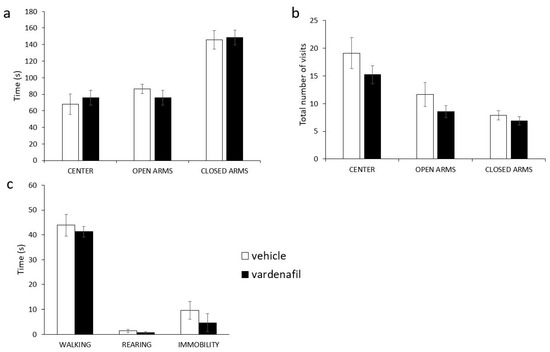 No effects of Vardenafil on behavioral responses in the elevated plus maze showing the total time spent in (a) and the total number of visits to the different areas of the maze (b); (c) total time spent walking, rearing and not moving in the open field test. Vehicle n = 8; Vardenafil n = 9.