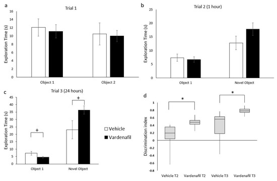 Object recognition test. (a) Exploration time between vehicle and Vardenafil in the first session (T1; familiarization session). (b) Exploration time between vehicle and Vardenafil in the second session, T2. (c) Exploration time between vehicle and Vardenafil in the second session, T3. (d) Median and interquartile range (IQR) for the Discrimination Index (DI) at 1 h and 24 h from exposure to the familiar object. * p < 0.05 from a hypothetical median of 0 at 1 h (T2) and 24 h (T3) delay, respectively. + p < 0.10. Vehicle n = 7; Vardenafil n = 9.