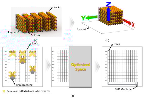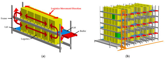 The online market is currently experiencing a significant surge, driven by advancements in information technology, and is actively shaping new global consumption trends, particularly in response to the impact of COVID-19. This evolving trend has led to a noticeable increase in the volume of small orders for various products, highlighting the growing importance of same-day delivery services [1]. Notably, same-day delivery services for fresh food, considered essential, have gained considerable attention in Korea, with their scale consistently expanding alongside the spread of COVID-19. Consequently, efficient logistics systems have become crucial, making the expansion and innovation of automated logistics warehouses indispensable [2]. In particular, there is a growing interest in logistics warehouses responsible for the selection and retrieval of ordered goods from inventories [3]. While the importance of warehouse management has been emphasized in the past, traditional warehouses were primarily perceived as places for storing goods. However, recent years have seen a rapid increase in logistics volume in Korea, particularly under the influence of services like same-day delivery. The ability to quickly locate and process goods within warehouses has thus become paramount. Moreover, owing to the escalating land prices in metropolitan areas of Korea, driven by dense population centers, the demand for warehouses that maximize space utilization and operational efficiency has surged [4,5]. These logistics warehouses, primarily concentrated in the Seoul Capital Area, are undergoing modernization and evolving into logistics warehouses that incorporate artificial intelligence to create new added value [6]. Major e-commerce and logistics companies, such as Coupang, CJ Logistics, and Lotte Mart in Korea, Amazon in the United States of America, Ocado in the United Kingdom, DHL in Germany, and JD.COM in China, are expanding their investments in automated warehouses as a crucial strategy to enhance their competitiveness [7]. However, existing automated logistics warehouses face limitations in achieving both spatial efficiency and increased speed of logistics operations. These limitations stem from constraints based on horizontal expansion, complexity of stacked systems, and high land prices in densely populated areas [8]. Logistics warehouses prioritize quick delivery and accessibility, leading to the concentration of most warehouses in metropolitan and other densely populated regions. Given the characteristics of these areas, land prices are exorbitant, which increases warehouse construction costs and makes it increasingly challenging to secure new spaces nearby. Consequently, the issue of space utilization in existing warehouses becomes a pivotal consideration, accompanied by several constraints. First, the expansion of logistics warehouses in confined spaces primarily relies on horizontal expansion [9]. However, securing additional land in surrounding areas in densely populated regions is a formidable challenge. Additionally, the expansion of stacked systems presents its own set of challenges. Constructing high-rise buildings must account for various variables, including structural stability, fire and safety regulations, and logistics operational efficiency. Therefore, simply adding floors to warehouses is a limited solution. These challenges are critical factors influencing the efficient operation of logistics warehouses [8].
