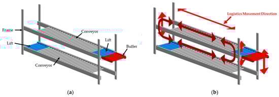 Once the inventory logistics are dispatched via handling devices and buffers, a repetitive process ensues where the next set of inventory logistics to be dispatched is located and positioned within the buffer. This operation, named the pre-transfer system (or free-transfer system), takes place independent of the stacker crane’s activities, occurring whenever both the buffer and lift positions are unoccupied. Figure 3a illustrates the concept of the bidirectional infinite-loop module, while Figure 3b indicates the movement directions of the logistics (arrows represent buffer directions) and the conveying devices, including conveyors and lifts.