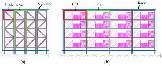 To store the same amount of logistics, the number of rows and columns of the rack was set according to the type of transportation equipment used to match the height of the rack. The number of logistics calls was set at a maximum of 1800 PLT (pallet). The logistics storage method within the rack was assumed to be random storage (free location). The specific attributes of stored logistics were defined with a height, width, and length as 1.1, 1.1, and 1–1.6 m, respectively. Each storage unit was assumed to contain a single item. Figure 5a,b show a plan view of the rack, where the terms used for each unit are indicated.