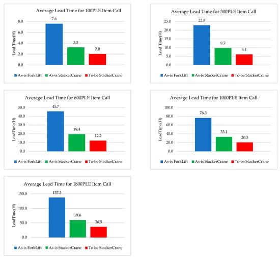 The to-be stacker crane model took 2.03 h to process 100 PLT, 6.09 h for 300 PLT, 12.15 h for 600 PLT, 20.28 h for 1000 PLT, and 36.53 h for 1800 PLT. These results indicate that the to-be stacker crane model can efficiently utilize time, with improvements ranging from approximately 37.54 to 73.22% when compared to the as-is fork lift and as-is stacker crane models. Thus, we demonstrated that time optimization is achievable using our proposed warehouse design.