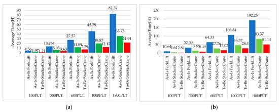 Figure 8 visually represents the results of the experiments on the call durations of logistics using a simulated bottleneck phenomenon. In Figure 8a, the results are represented based on the total logistics volume of 100, 300, 600, 1000, and 1800 PLT, with each scenario allocating 30% of the total logistics volume for input. It is evident that the to-be stacker crane model consumed less time compared to the as-is stacker crane and as-is fork lift models. Figure 8b illustrates the results when 70% of the total logistics volume, based on 100, 300, 600, 1000, and 1800 PLT, is allocated for input. Again, the to-be stacker crane model exhibits lower time consumption compared to the as-is stacker crane and as-is fork lift models. Through these observations, it is confirmed that the developed model approach is highly time efficient.
