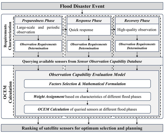 Given the abovementioned flood-water-observation-oriented optimum sensor selection problem, this study proposes the OCEM based on the analysis of flood-event-related studies [34,35,36]. Figure 1 shows the framework of the OCEM, which takes a flood disaster event as input and outputs a ranking of available satellite sensors by quantitatively evaluating their observation capabilities while accounting for the flood spatiotemporal characteristics of the flood. The framework consists of two components, requirements characterization and OCEM calculation, and the detail of each of them is as follows.
