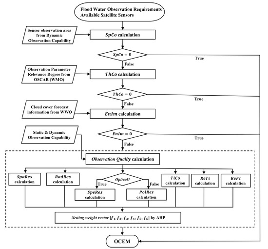 First, as depicted in Figure 1, the available satellite sensors would be queried from the SOCDB based on the observation requirements specific to one particular flood phase. Then, the detail value of each observation capability factor (e.g., SpCo) of those queried sensors would be calculated. The detailed calculation of those factors will be introduced in Section 2.3.1.