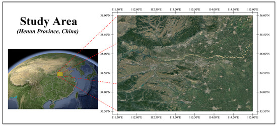 A heavy rainfall occurred in Henan Province, China, during 18 July and 21 July 2021, causing severe flood disasters, such as landslides and mudslides. In this flood disaster, 302 people lost their lives, 50 people were missing, more than 580,000 hectares of farmland were affected, and the economic loss was estimated to be approximately USD 18 billion [51]. This study selects this flood disaster as the background to conduct the flood-water-observation-oriented satellite sensor selection experiment, and Figure 3 shows the selected study area at longitude and .
