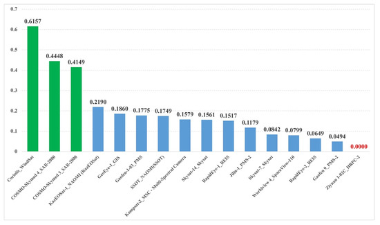This reflects the capability of the sensor to recognize spectral features of ground objects [40], and a higher spectral resolution (smaller wavelength interval) facilitates better observation of complex flood scenarios, such as flood water, vegetations, and houses. SpeRes can be calculated by using Equation (10), where is the task’s required spectral resolution, is the task’s required wavelength range, is the wavelength range of the sensor, and is the wavelength range intersection of the task and sensor.- (4)