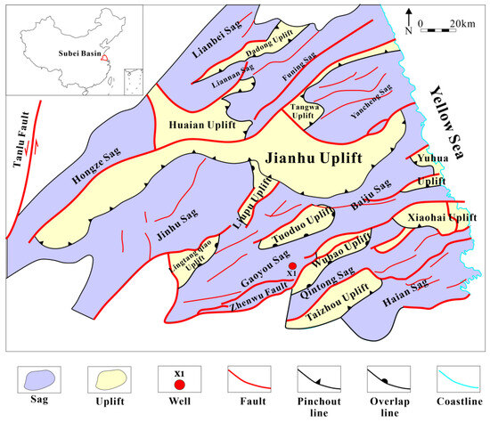 The Subei Basin is a sedimentary basin with origins dating back to the continental Mesozoic and Cenozoic periods. It formed upon the foundation of the Cretaceous-period bedrock. Encompassing a vast expanse of approximately 3.5 × 104 km2, the Subei Basin is located in the eastern region of China [7]. The basin is delimited by the Sulu uplift in the northern direction, the Sunan uplift in the southern direction, the Tanlu fault zone in the western direction, and the South Yellow Sea Basin in the eastern direction.
