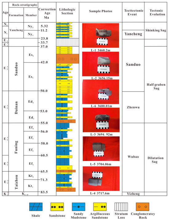 The Gaoyou Sag demonstrates a sequential geological progression from the lowermost stratum to the uppermost stratum, encompassing five significant formations: the Taizhou Formation from the Cretaceous period, the Funing Formation from the Paleogene era, the Dainan Formation, the Sanduo Formation, and the Yancheng Formation from the Neogene epoch, as depicted in Figure 2. The stratigraphic characteristics are concisely outlined as follows. The Taizhou Formation exhibits a thickness ranging from approximately 100 to 300 m. The spatial distribution of lithology exhibits significant variability. Within the Taizhou Formation, the lower section displays a consistent occurrence of interbedded (dark) brown sandstone and mudstone throughout the entire region. Additionally, the sedimentary rhythm within this formation is characterized by a lack of distinct patterns. The eastern region of the Gaoyou Sag exhibits a significant abundance of dark mudstones, serving as a prominent source rock within the Subei Basin. The Dainan Formation in the Gaoyou Sag exhibits a thickness ranging from 300 to 1500 m. This formation is distinguished by the presence of light-gray (powder) fine sandstone, variegated glutenite, and deep gray-brown mudstone, which are interbedded with varying thicknesses.