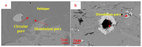 The second category of pores comprises dissolution pores, which are created by the dissolution of unstable minerals such as calcite, quartz, and feldspar as a result of the influence of organic acids released during the thermal transformation of organic matter [33]. These dissolution pores are predominantly isolated and densely distributed in circular or oval shapes (Figure 6). These materials demonstrate a relatively limited distribution of pore sizes, typically measuring in the tens of nanometers, on average. Additionally, they exhibit suboptimal connectivity between pores.