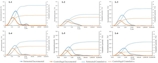 NMR experiments were conducted at the National Key Laboratory of Oil and Gas Resources and Engineering of China University of Petroleum (Beijing, China), utilizing the nuclear magnetic resonance analyzer manufactured by Suzhou Newmark analytical instruments Co., Ltd., (Suzhou, China) with the model number of MicroMR12-150H-I. A resonance frequency of 12.798 MHz, magnet temperature of 35 ± 0.02 °C, probe coil diameter of 25 mm, and magnetic field strength of 0.28 t were also utilized. Before conducting the experiment, all samples underwent a drying procedure in a drying oven set at a temperature of 105 °C for a duration of 6 h in order to eliminate any traces of moisture present in the samples. The dried specimen was subjected to water saturation for a duration of 24 h using a vacuum-pressure saturation apparatus, while maintaining a pressure of 30 MPa. Nuclear magnetic resonance (NMR) was used to measure the saturated and centrifuged samples in order to acquire the T2 spectrum and pore parameter data, such as porosity, permeability, and the relaxation-time cutoff. The samples were centrifuged at 10,000 rpm for 8 h using a hc-3018r high-speed freezing centrifuge, and subsequently, their T2 spectrum distribution was measured again in the NMR instrument. The echo time was 0.07 ms; the number of echoes was six thousand. The number of scans was thirty-two.
