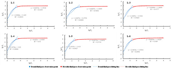 The NMR fractal dimension of shale samples derived from the Funing Formation in the Gaoyou Sag is depicted in Figure 8. The curve demonstrates a clearly discernible two-stage pattern. The fractal curve can be partitioned into two distinct segments, delineated by the T2C cut-off value. The segment featuring relaxation times less than T2C represents bound-fluid pores, while the segment with relaxation times exceeding T2C represents movable-fluid pores. By linear fitting of the two parts, the bound-fluid-pore fractal dimension (DMin) and the movable-fluid-pore fractal dimension (DMax) (Table 3) are obtained. The observed high values of the fitting degrees suggest that NMR fractal analysis can be employed as a viable method for characterizing the pore structure. It can be seen from Table 3 that DMin is between 0.5795~1.3813 (the average value is 0.8110); DMax ranged from 2.9592 to 2.9793 (mean 2.9651).