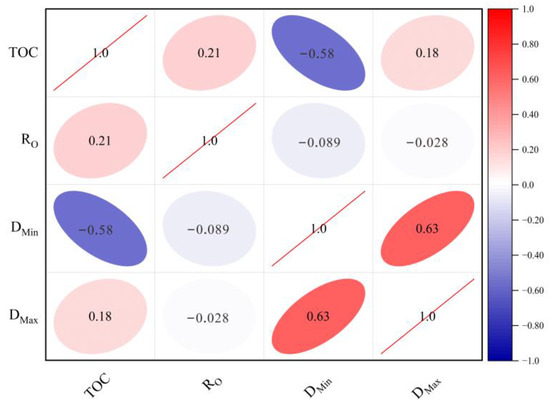 - The organic geochemical characteristics and mineral composition of shale exert varying degrees of influence on the NMR fractal dimensions characterizing the two pore structures. Specifically, TOC, quartz, calcite, illite–smectite, illite, and chlorite impact DMin, with all except calcite and illite–smectite showing negative correlations. Organic matter content and mineral composition play a significant role in controlling the fractal dimension.