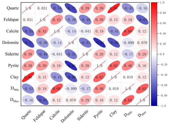 The mineral composition of shale is a significant factor in determining the pore structure and connectivity. The investigation into the relationship between NMR fractal dimensions and the mineral composition of Funing Formation shale in the Gaoyou Depression revealed notable impacts of different mineral constituents. (Figure 10). The analysis reveals that DMin and DMax exhibit negative correlations with the quartz content and that DMax displays a particularly significant negative correlation with the feldspar content. The observed phenomenon can be explained by the relatively even surfaces of quartz and feldspar minerals, which lead to a reduction in the variability of pore structures. As a result, there is a decrease in the fractal dimensions. Moreover, quartz, having fewer pores and offering limited pore complexity, leads to a reduction in the fractal dimension DMin.